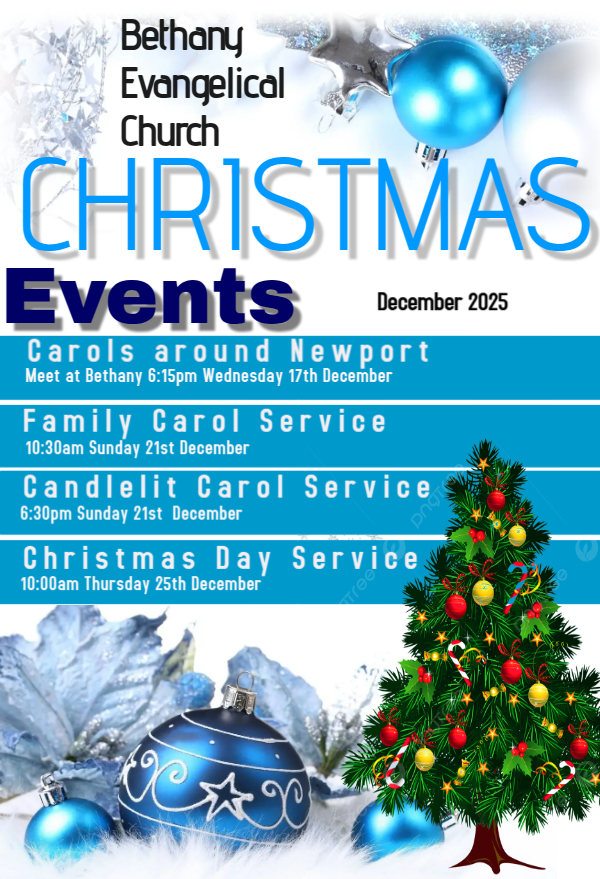 To join in and enjoy singing carols around Newport - weather permitting meet at Bethany 6:15pm. Refreshments afterwards in the side hall.